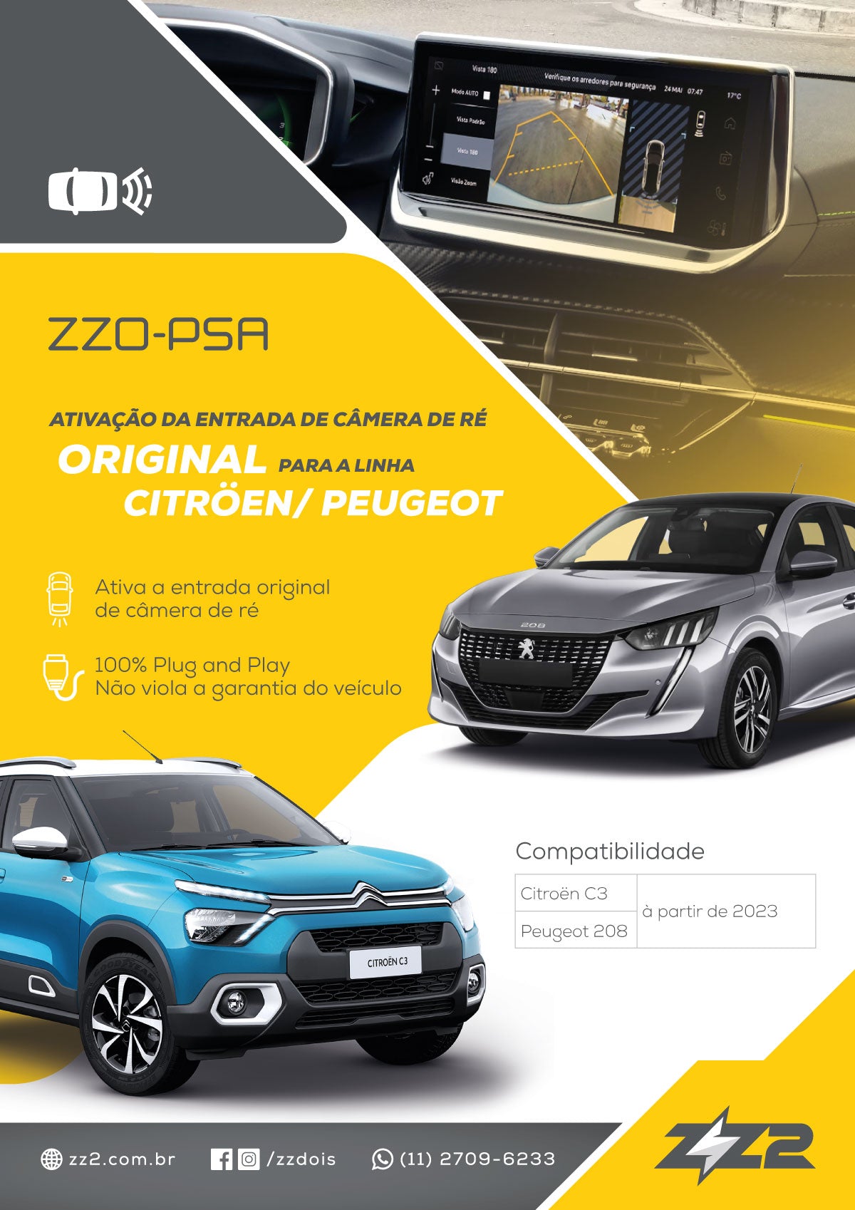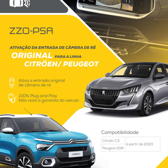 A interface ZZO-PSA ativa a entrada original do veículo para a câmera de ré, facilitando os movimentos de entrada, saída e estacionamento. É compatível com Peugeot 208 e Citroën C3 / C3 AirCross (modelos a partir de 2023).